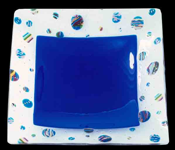 My bowls are of fused glass—so pieces and layers of glass melted together in a kiln—and then "slumped" or "kiln-formed" through ring-molds in the kiln where they flow downward to a kiln shelf below.