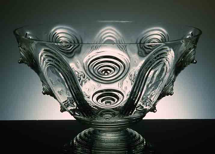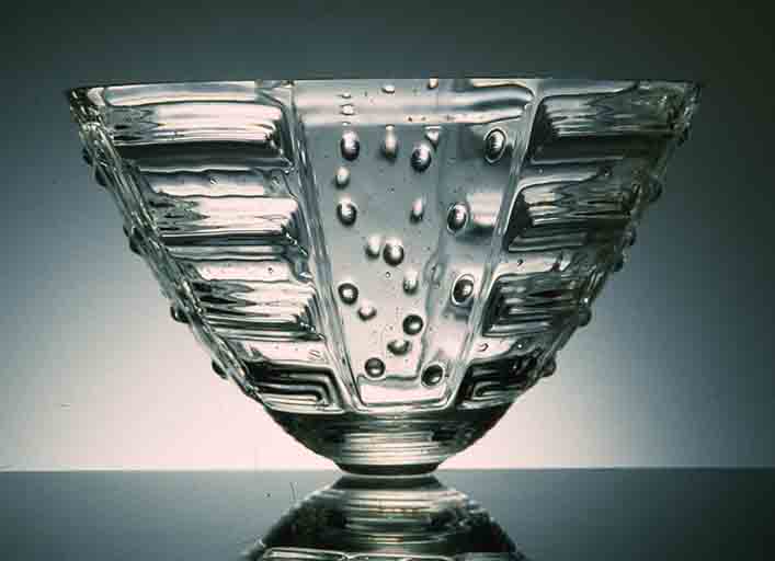 The basic techniques involved applying swatches of lustre freehand, using a banding wheel, a small spinning platform on which a wineglass could be centered for application of the lustre in-the-round, and masking and sandblasting to define areas of transparent color.