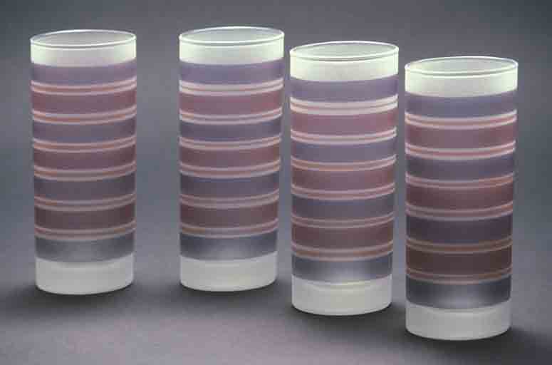 "Stripes and Bubbles" employed a general color for the various glasses, and then fine stripes that were set in a separate kiln firing. The wide center band used a "wet on wet" technique, where a basically clear "mother of pearl" lustre paint was applied, and while wet point of other lustre colors were touched to the wet base and a nice natural dispersion occurred.