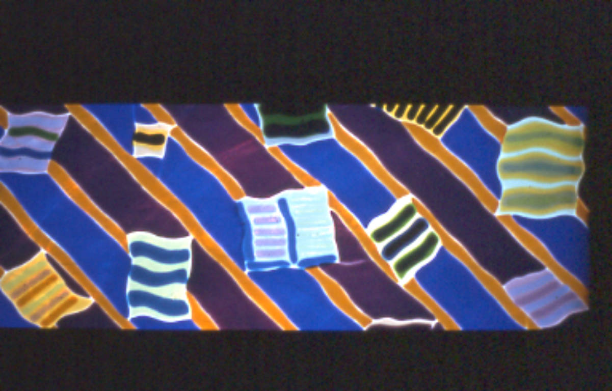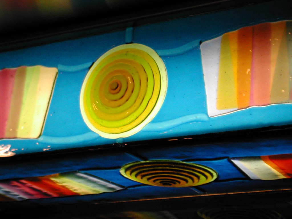 The more dream-like lower band shows unformed dancing figures, faces as character types, and floating paper pages.The glass technique employed has come to be called "fused glass"—essentially the melting together in a kiln of glass pieces placed side-by-side or layered.