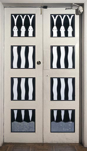 I pulled a fast one and designed these panels to fit into the existing openings of the gallery doors. I expected to remove them after the exhibit.