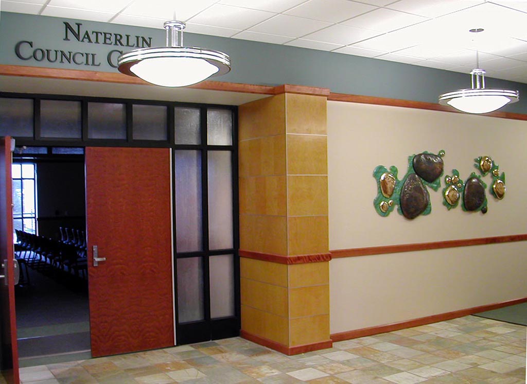 We oriented the chosen blocks to be ordered lines. Ellen designed the cut aluminum sculpture for a central part of the wall and a couple of topical wall inserts at the public service entry porch.