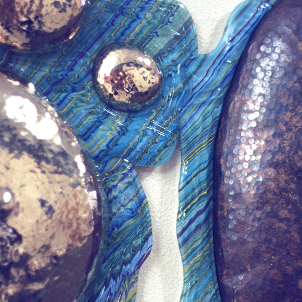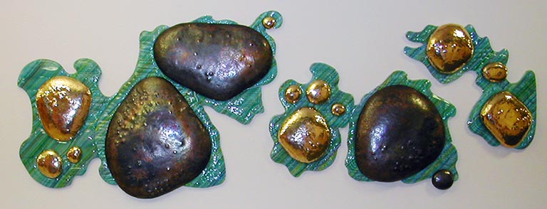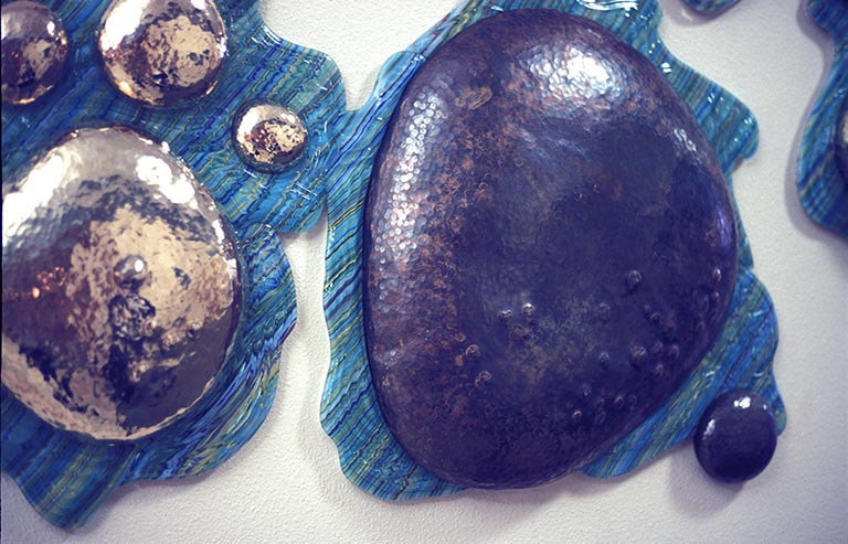 Greg makes what is called raised metal. From a flat sheet of metal and using only variously shaped hammers and, as a backing for the blows, metal stakes, he strikes the metal over and over- thousands of blows. With the resulting compression and expansion of the metal, pieces take shape. Greg made boulder-like shapes which he turrned in at the bottom so the glass watery elements could be tucked around and beneath them.