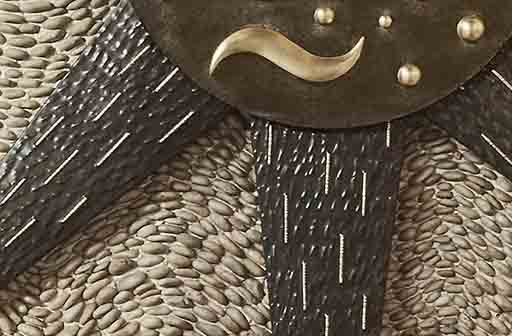The talented local metal worker Randy Ortiz of Ortiz Metals made the raised and repousséd metal rays that tuck neatly under the thick dark glass disk that supports gold-leafed elements. I made the pebble mosaic field. It was also a pleasure to work with Chris Roberts of opsis architecture and the UO planning staff and science department folks.