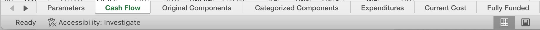 We create an Excel workbook with pages (worksheets) as shown above. These pages list the reserves components in detail and different pages have costs calculated in various ways.