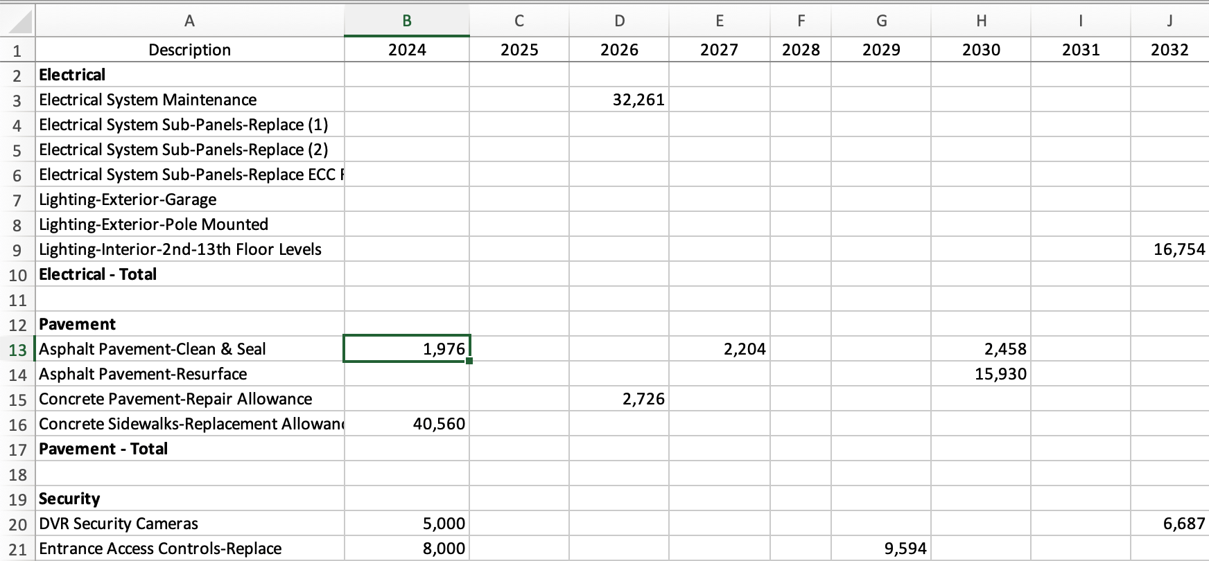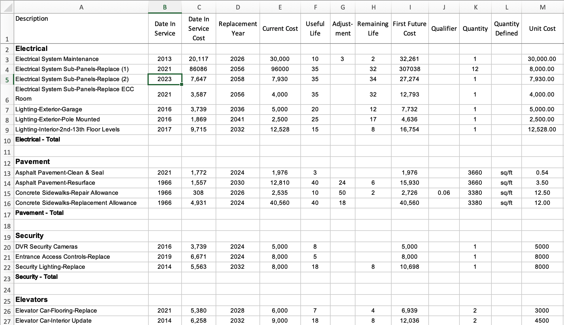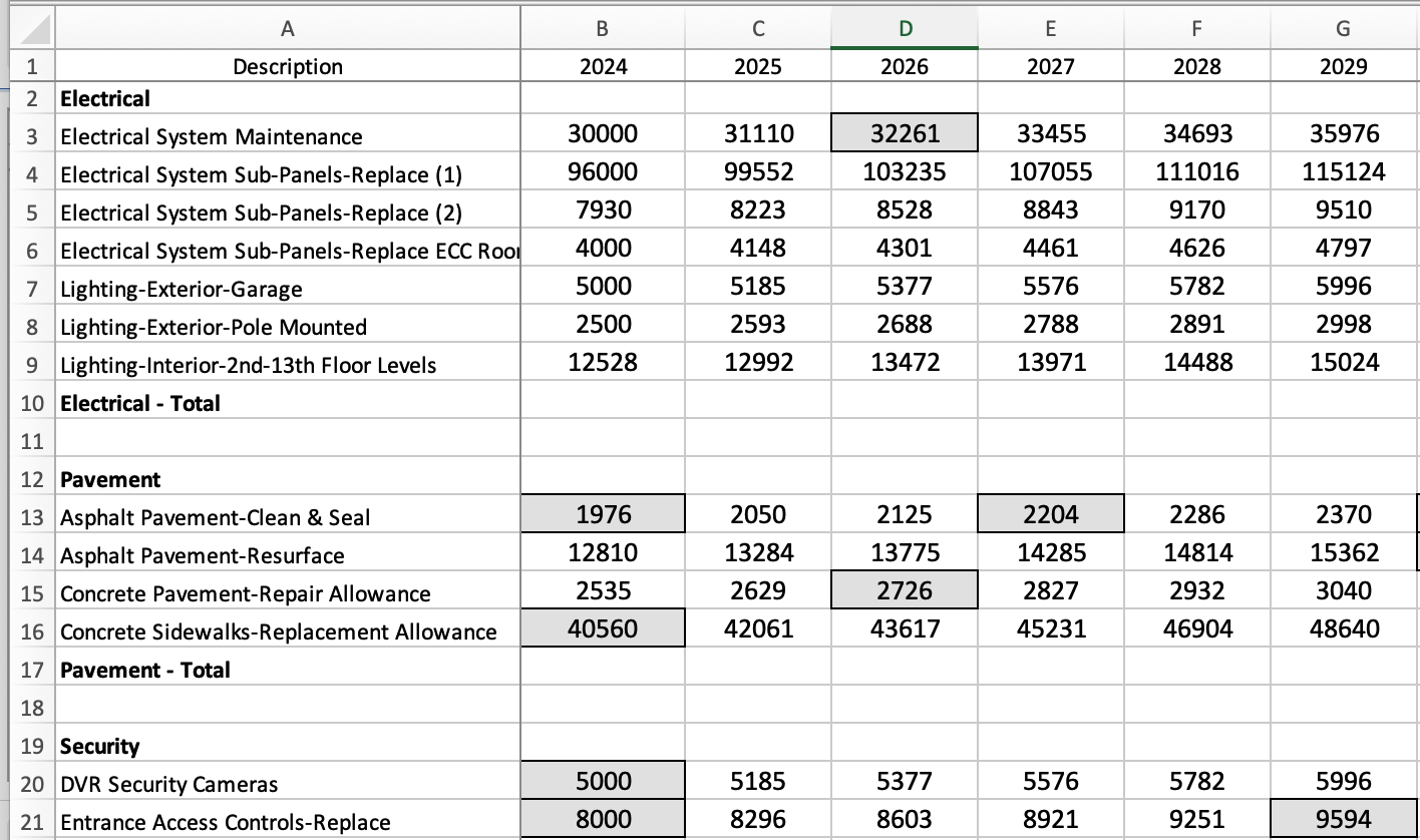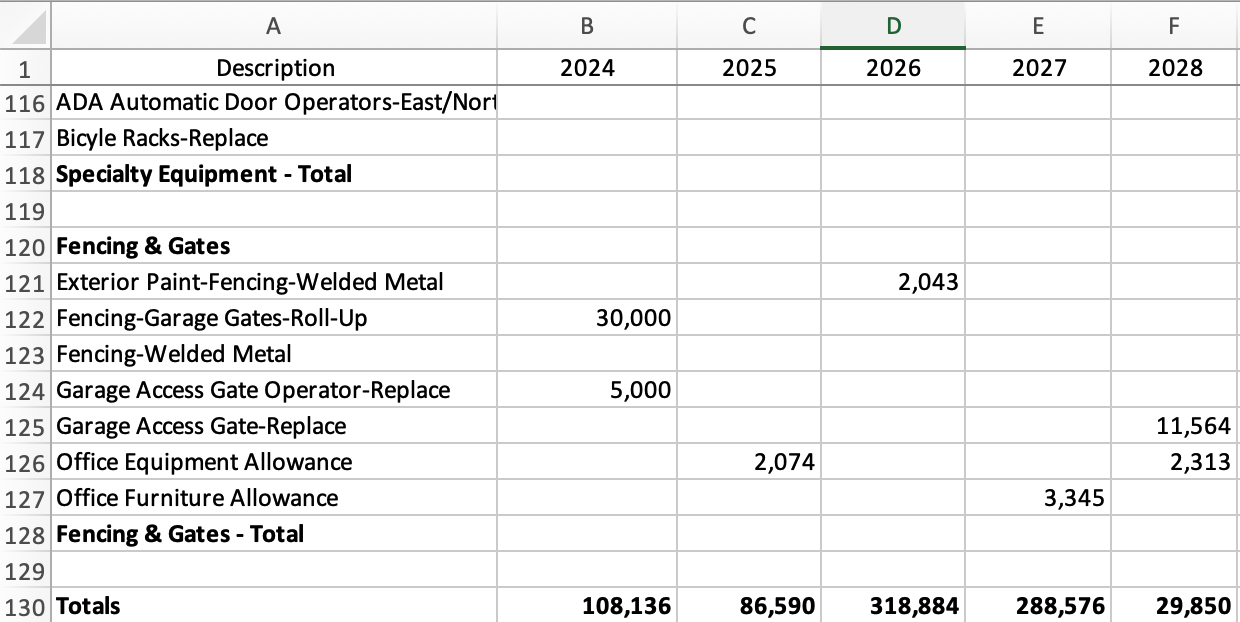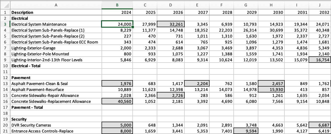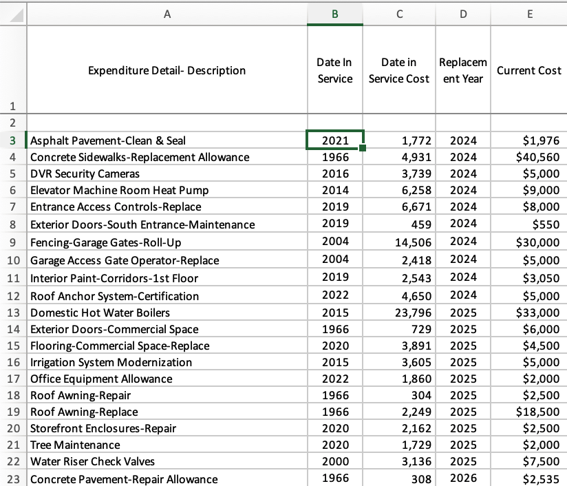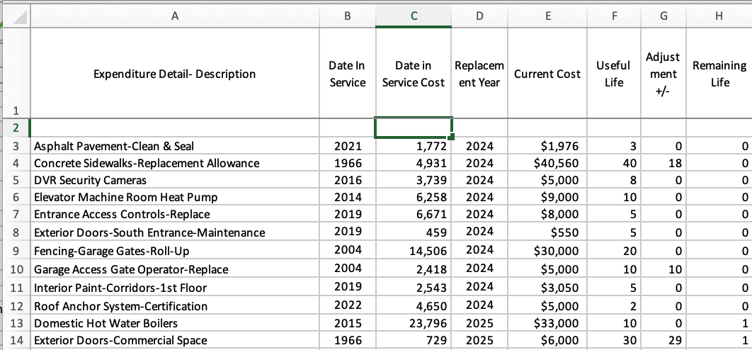 The first few items in the Replacement Year column are due to be serviced in 2024 which, for our purposes at the time of this writing, is also the current planning year. When the next planning year rolls around, having serviced the item in the previous year, we should update that item's Date in Service to the year in which it was done and the Date in Service Cost to what was the actual cost that was paid. Having serviced that item, the cycle of that component's Useful Life begins anew.