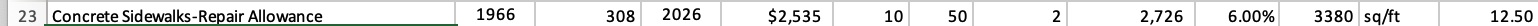 We must also consider if there is a qualifier. There is an example on row 23 and is for "Concrete Pavement - Repair Allowance." It is calculated using the full cost of replacing all the concrete Pavement—all 3,380 square feet of it—but since this is just for some repair, it was decided that 6% of that total cost would cover a typical repair.
