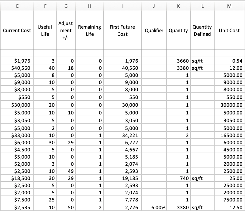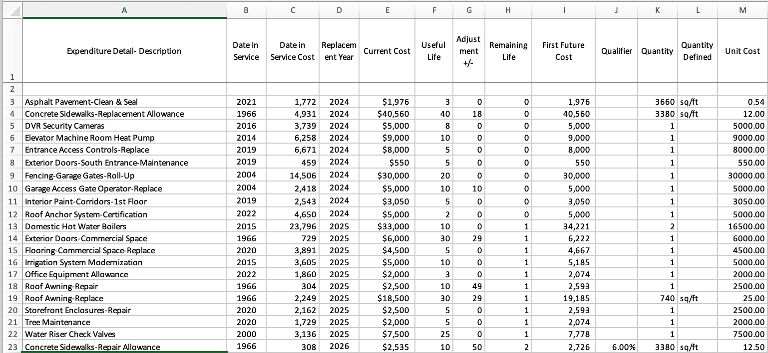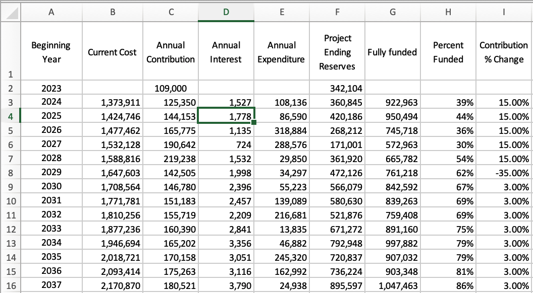 That professional study was, I believe, created with Reserve Study HOA software, which can be purchased. It could be a time saver, but my interest is to fully understand the formulas and connections that make up a study without the expense—thus this creation of an Excel version.