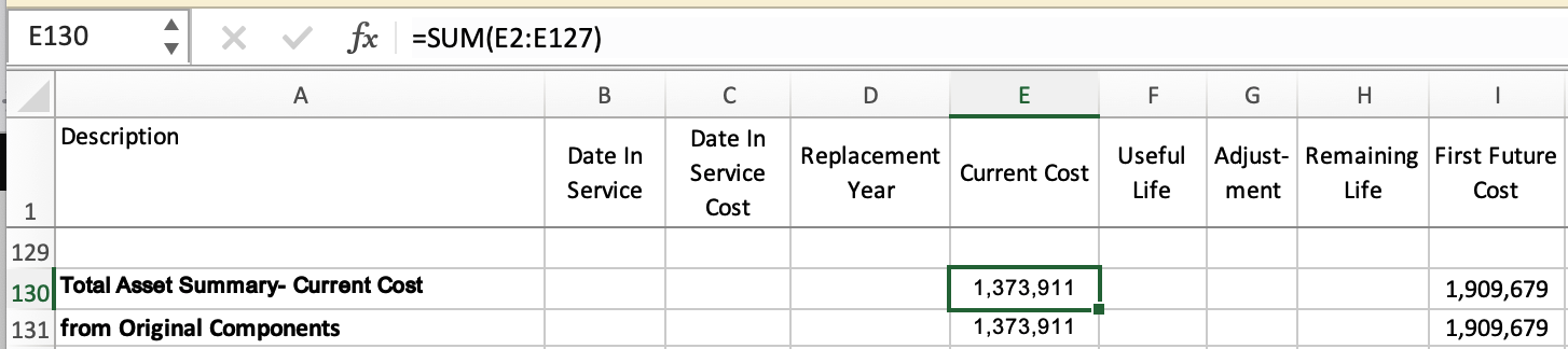 - Current Cost entries are totals that will be pulled in from the Current Cost page. The Current Cost of a component is what servicing that item would cost in the current year, even though the item may not be scheduled for many years to come.
