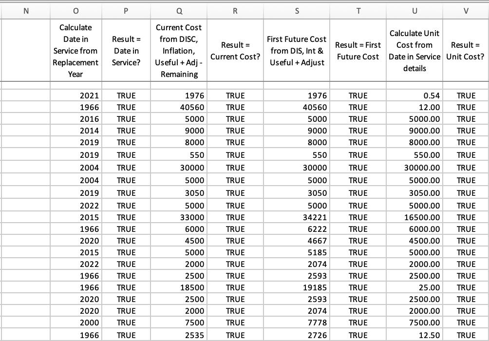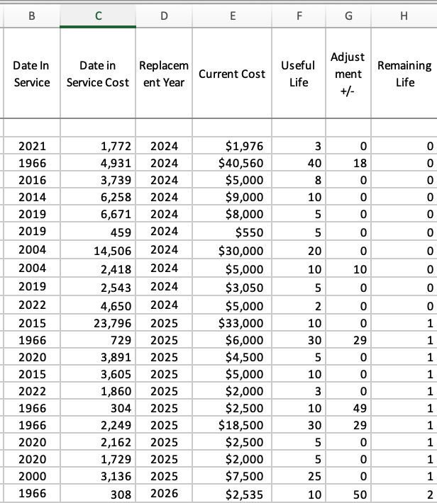 When an item is serviced in the current year, the Remaining Life is 0. The items serviced in the current year could just as well be listed with dates in service of the current year (example 2024) and with what we arrive at as the current cost in Date in Service Cost.