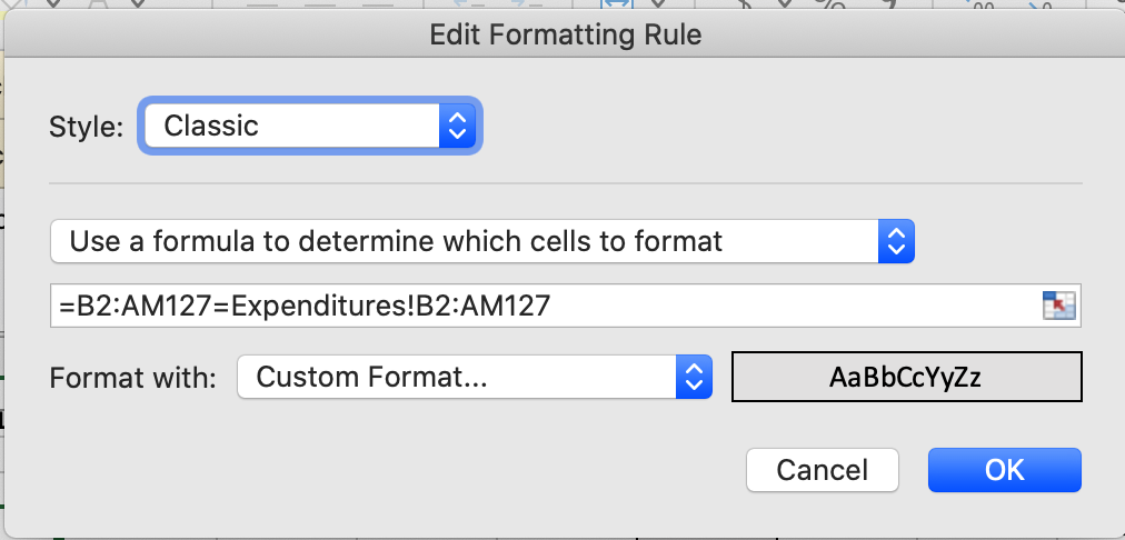 We use the Excel feature of conditional formatting to apply that background and border (or whatever other setting one might want) when the amounts on this spreadsheet match up with the amounts that appear on the Expenditures page.