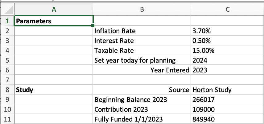 Those first four items, Inflation Rate, Interest Rate, Taxable Rate, and Current Planning Year are the key ones for the Parameters page. I add the amounts in the "Study" part of the page as a reference for some key calculations on the Cash Flow page. These are amounts from the year previous to the study.
