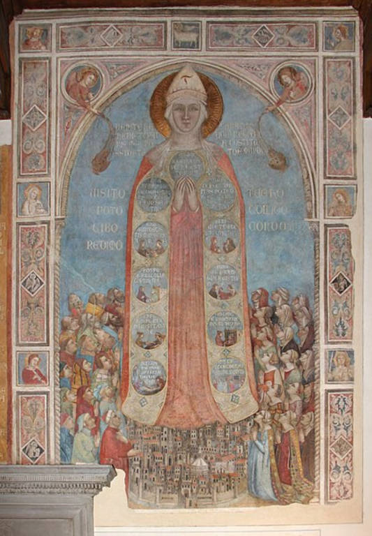 This detail of the Madonna della Misericordia is famous for its depiction of the baptistery and the Duomo under construction showing a facade (not realized) by Arnolfo di Cambio. The existing Duomo facade is from the 19th century and considered Victorian in style.